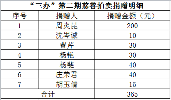 ? ? 昆山農(nóng)商銀行黨辦、董辦、行政辦(以下簡(jiǎn)稱“三辦”)于10月28日下午牽頭組織開展了第二期“三辦”慈善拍賣會(huì),拍賣款項(xiàng)全部捐至昆山農(nóng)商銀行慈善基金會(huì),以推進(jìn)社會(huì)慈善公益事業(yè)發(fā)展,具體捐贈(zèng)明細(xì)如下:
