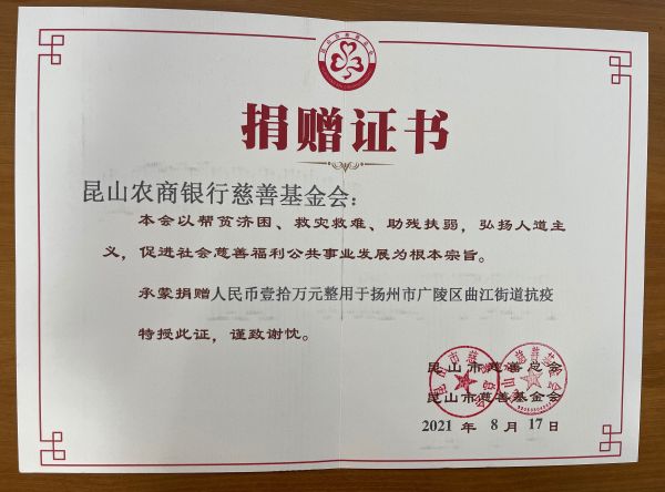 昆山農(nóng)商銀行慈善基金會捐贈10萬元援助揚州疫情防控