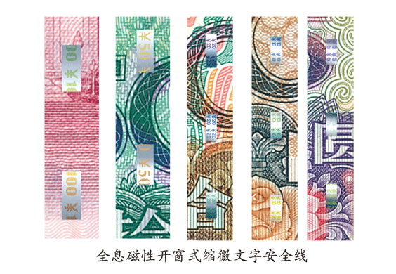 人民幣從第四套1990年版開始運用安全線這項防偽技術,1990年版50元、100元,使用普通全埋式安全線。第五套1999年版的安全線,開始加印縮微文字和全息文字。100元、50元為磁性縮微文字安全線,20元為磁性間斷式安全線(無字),10元和5元首次使用全息磁性開窗式安全線。安全線的植入方式由全埋式改為開窗式,所謂開窗,是指線體材料等距間斷埋入紙中和裸露在紙表面;材料由單一的聚酯材料改為有閃光效果的復合材料。