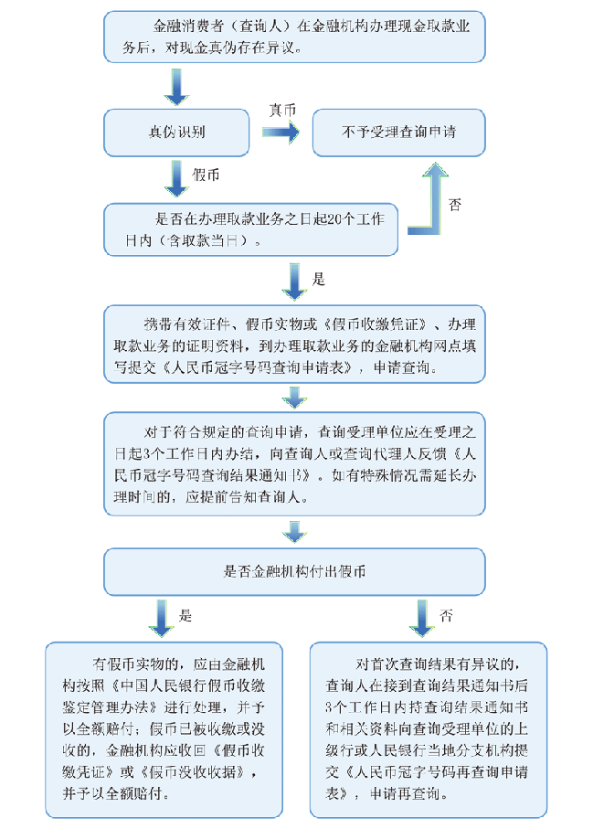 金融消費者(查詢?nèi)耍┰诮鹑跈C構(gòu)辦理現(xiàn)金取款業(yè)務(wù)后,對現(xiàn)金真?zhèn)未嬖诋愖h,經(jīng)金融機構(gòu)進行真?zhèn)巫R別確認(rèn)是假幣的,查詢?nèi)丝上蜣k理取款業(yè)務(wù)的金融機構(gòu)網(wǎng)點(查詢受理單位)提出冠字號碼查詢業(yè)務(wù)申請,以確認(rèn)假幣是否由該金融機構(gòu)網(wǎng)點付出。